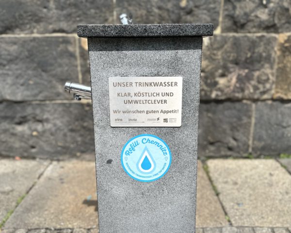 Auch an Trinkbrunnen kann auf die Refill-Initiative hingewiesen werden, wie hier in Chemnitz.