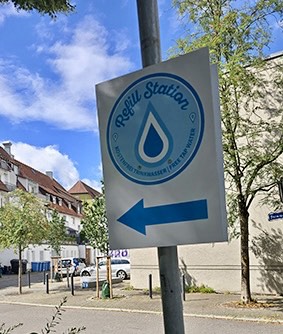 Ein Hinweisschild zur nächsten Refill Station – eine Idee aus Kaufering