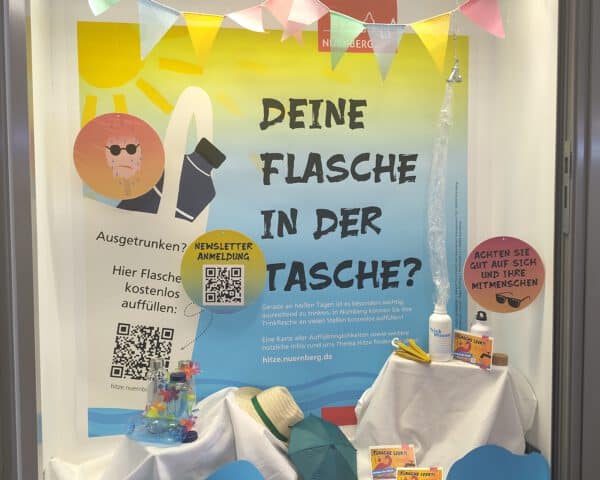 Ein Schaukasten-Fenster, das im Rahmen des Hitzeaktionsplans ans Trinken erinnert – eine Idee der Stadt Nürnberg.