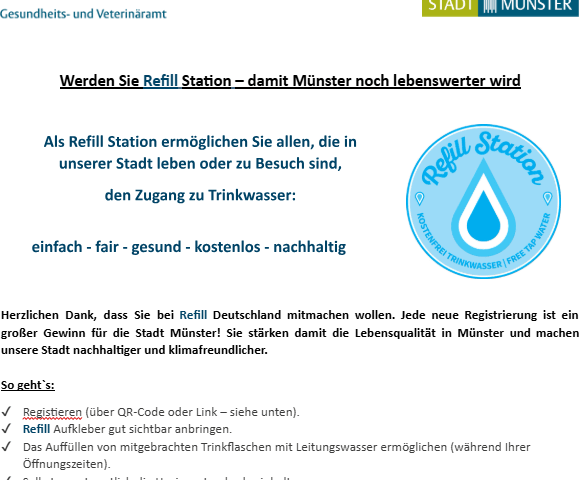 “Starter Paket” der Stadt Münster für neue Refill-Stationen: umfasst den Refill-Aufkleber, einen Aufruf zur Beteiligung, ein FAQ, Refill-Anleitung zum Selbstbefüllen von Flaschen und eine Anleitung für die Registrierung. Das Paket kann ausgedruckt und im handlichen Din A 5-Umschlag zur Verteilung bei Präsensveranstaltungen bereitgestellt werden.