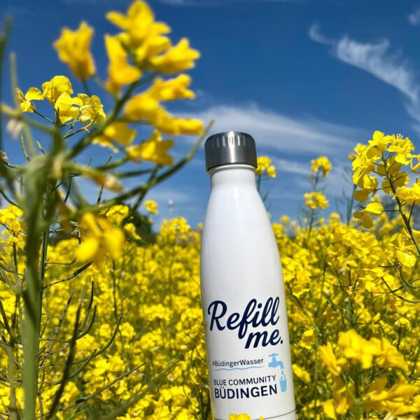 “refill me” bedruckte Wasserflasche – eine Idee der Blue Community Büdingen