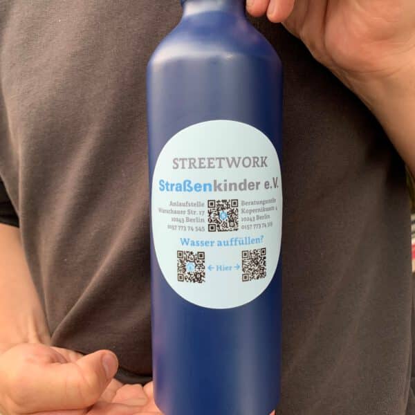 Ein Sticker mit QR-Code zur Refill Karte und weiteren Infos – eine Idee des Straßenkinder e.V.
