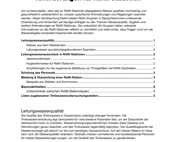 Um sicherzustellen, dass das an Refill-Stationen abgegebene Wasser qualitativ hochwertig und gesundheitlich unbedenklich ist, müssen spezifische Anforderungen und Regelungen beachtet werden. DiesDiese Übersicht soll Orientierung und Antworten auf häufige Anfragen zu den Themen Wasserqualität, Hygiene und weitere Anforderungen an Refill-Stationen bieten. Und euch als Refill-Gruppen dabei unterstützen, relevante Informationen an die Refill-Stationen effektiv zu vermitteln und stellt sicher, dass Fragen rund um die Wasserabgabe kompetent beantwortet werden können.