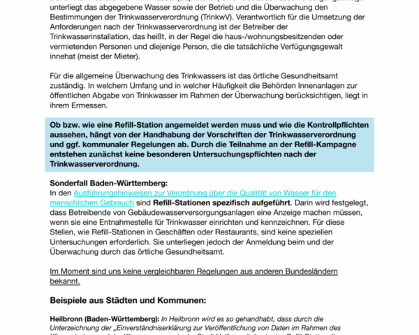 Heilbronn (Baden-Württemberg): In Heilbronn wird es so gehandhabt, dass durch die Unterzeichnung der „Einverständniserklärung zur Veröffentlichung von Daten im Rahmen des Klimaschutzes und der Klimaanpassung in der Stadt Heilbronn“ durch eine Refill-Station dieser Anzeigepflicht Genüge getan ist. Die in Heilbronn aktive Refill-Gruppe der Klimabotschafter*innen kümmert sich darum, neuen Refill-Stationen dieses Schreiben zukommen zu lassen.