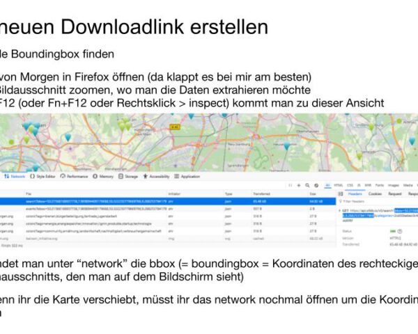 API-Zugriff: Es gibt eine API-Schnittstelle, über die Daten von der Karte von Morgen integriert werden können gibt es hier: app.swaggerhub.com/apis/Kartevonmorgen/openfairdb/. Die Daten sind odbl lizensiert . Zum Abrufen der Daten braucht man kein Token – Nur wenn man zurück speichern will z.B. um Updates zu schicken. Bei technischen Fragen kann das Team der Karte von Morgen am Besten helfen (info@kartevonmorgen.org).