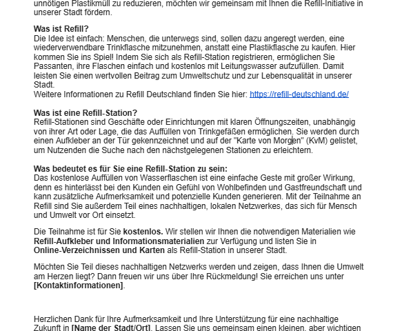 - 3. Nutzung bestehender Netzwerke: Informiert bei Treffen mit Vertretern potenzieller Refill-Stationen über die Initiative und motiviert sie zur Teilnahme, z.B. über E-Mail-Verteiler. Dazu gehören Gewerbevereine oder Einzelhandelsinitiativen.