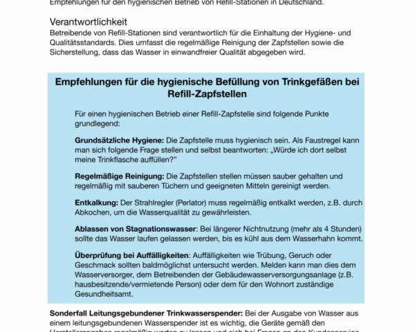 - 1. Hygieneprüfung: Informiert, dass das Leitungswasser in Deutschland regelmäßig überprüft wird und die Refill-Station selbst für die Einhaltung der Hygienestandards verantwortlich ist. Macht die Stationen mit dem Refill-Hygienekonzept vertraut. Dabei hilft auch das “Infoblatt: Hygiene in Refill-Stationen”.